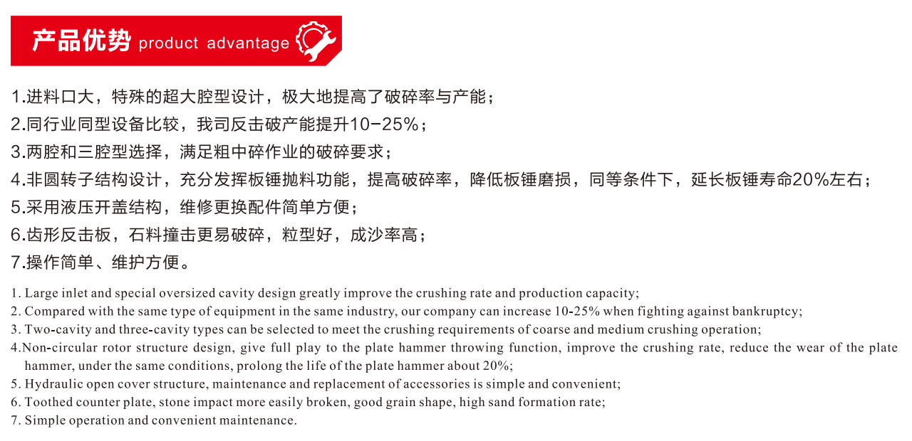 本系列產(chǎn)品是我公司總結(jié)吸收國(guó)內(nèi)外先進(jìn)技術(shù)的基礎(chǔ)上,經(jīng)優(yōu)化設(shè)計(jì)而研制出的一款新型三腔反擊式破碎機(jī)。廣泛應(yīng)用于高速公路建設(shè)、水利工程、建筑碎石、機(jī)制砂加工等領(lǐng)域。適用于抗壓強(qiáng)度不超過200Mpa各類物料的破碎,如青石、石英石、石灰石等。